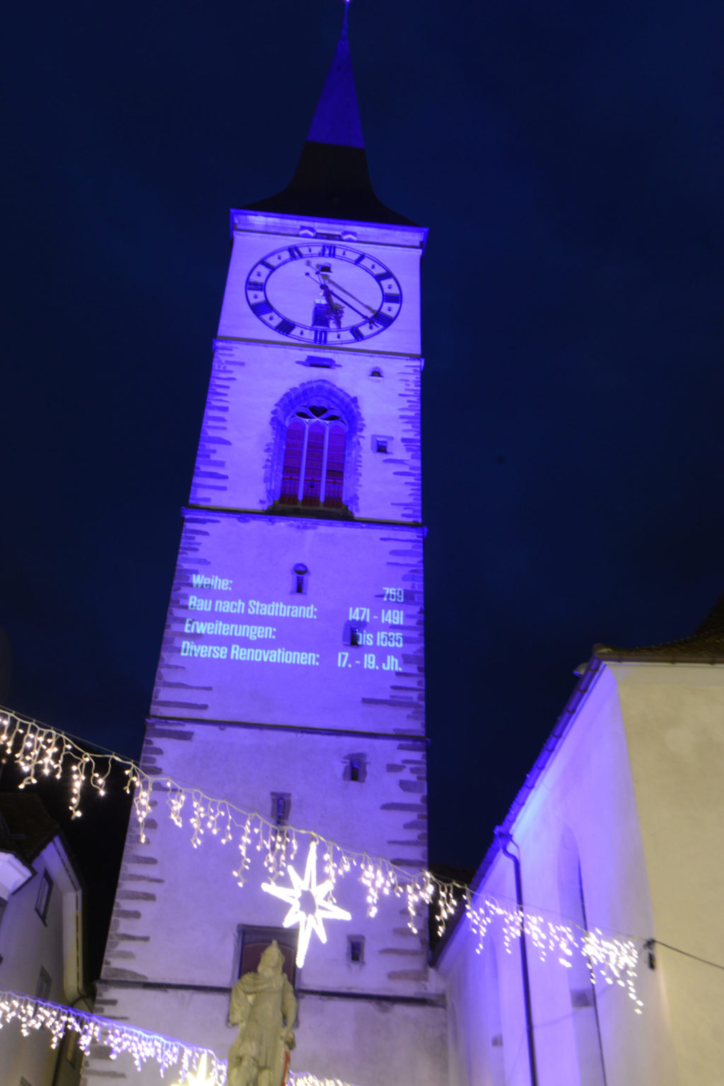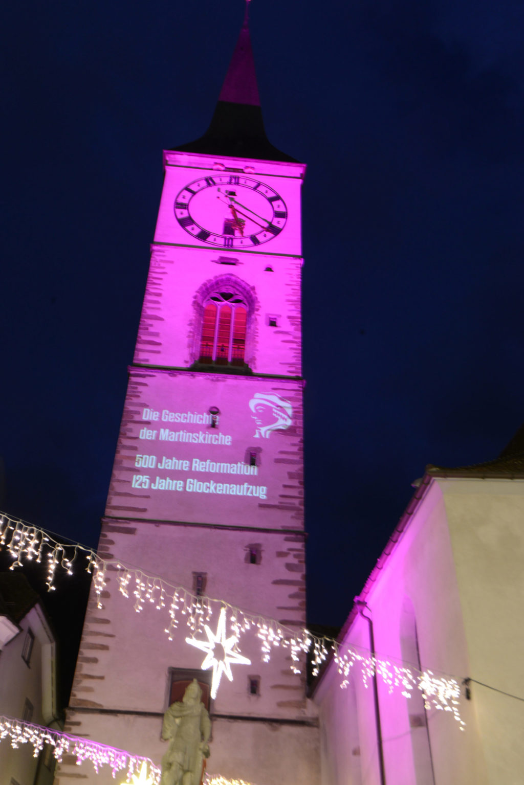 Der Turm der Martinskirche erstrahlte im Advent in einem besonderen Licht: jeden Abend wurde eine Illumination mit Leuchteffekten, historischen Bildern und spannenden Informationen zur Geschichte der Martinskirche gezeigt.