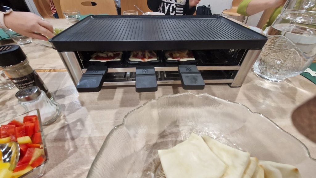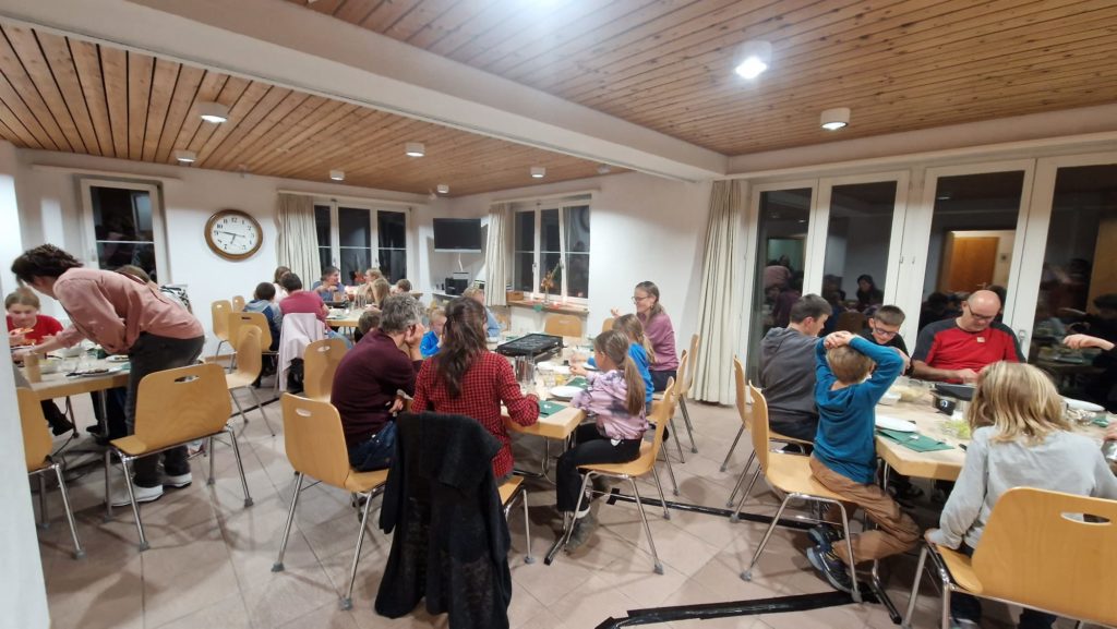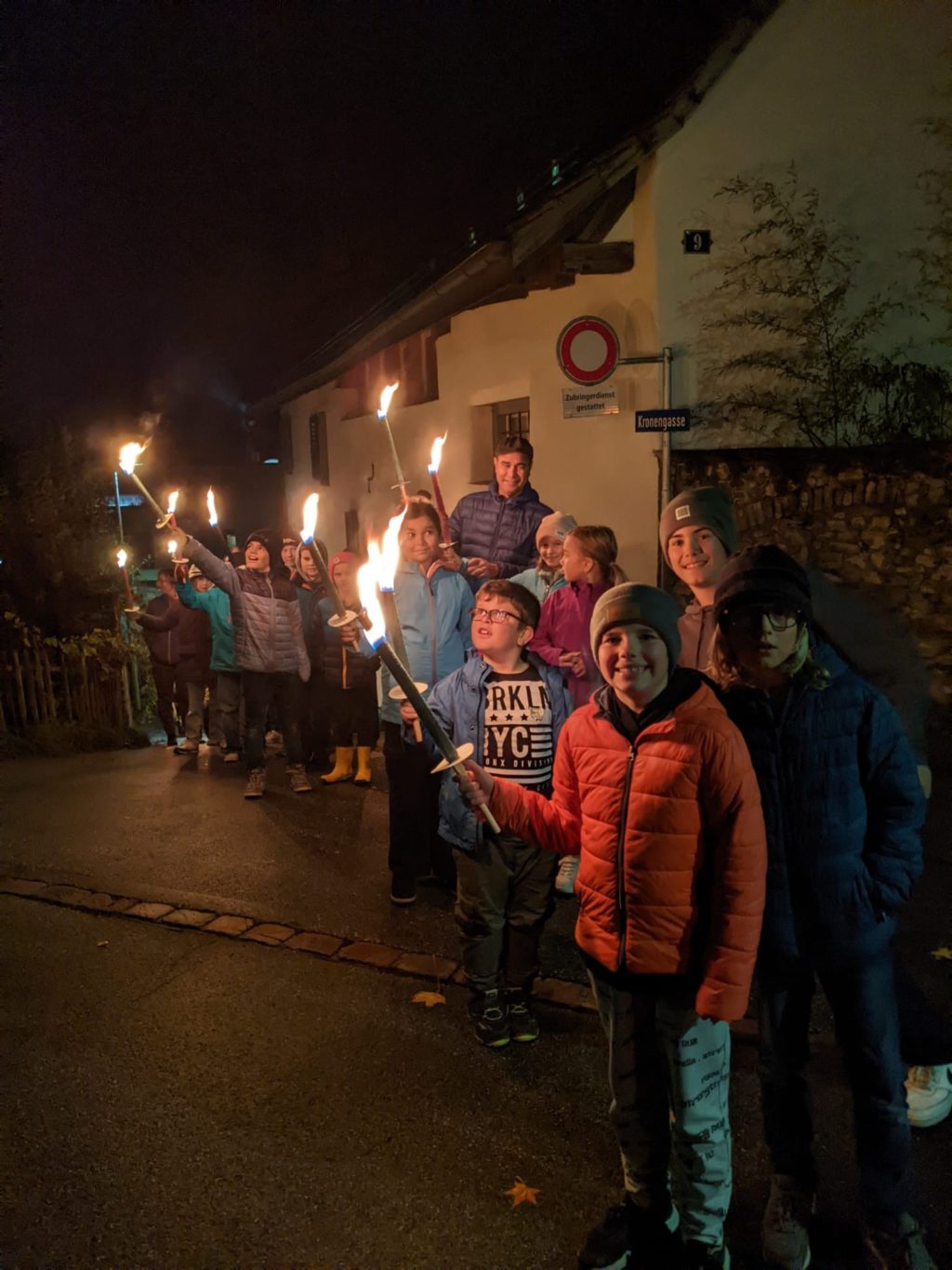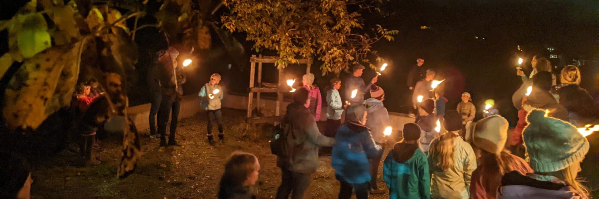 Im vom Kerzenlicht schummrig erhellten Saal, leuchteten den Kindern fluoreszierende Kreuze als Tischdeko entgegen. Sie wiesen bereits auf den reformatorischen Ausspruch «Post Tenebras Lux – Nach dem Dunkel das Licht» hin. Die Racletteofenpizzas genossen wir dann im hellen Licht und bei fröhlichem Geplauder. Nach einem Kurzfilm zum Reformationstag machten wir uns auf in die Dunkelheit. Mit Fackeln spazierten wir zum Aussichtspunkt am Fürstenwald, wo wir der Stadt ein Friedenslied zusangen.